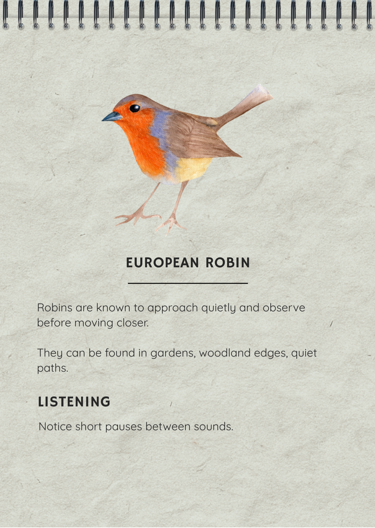 You don't need to know the birds. You don't need to identify the plants. The journal works whether you use it once a week on a long walk, or for five minutes by an open window.