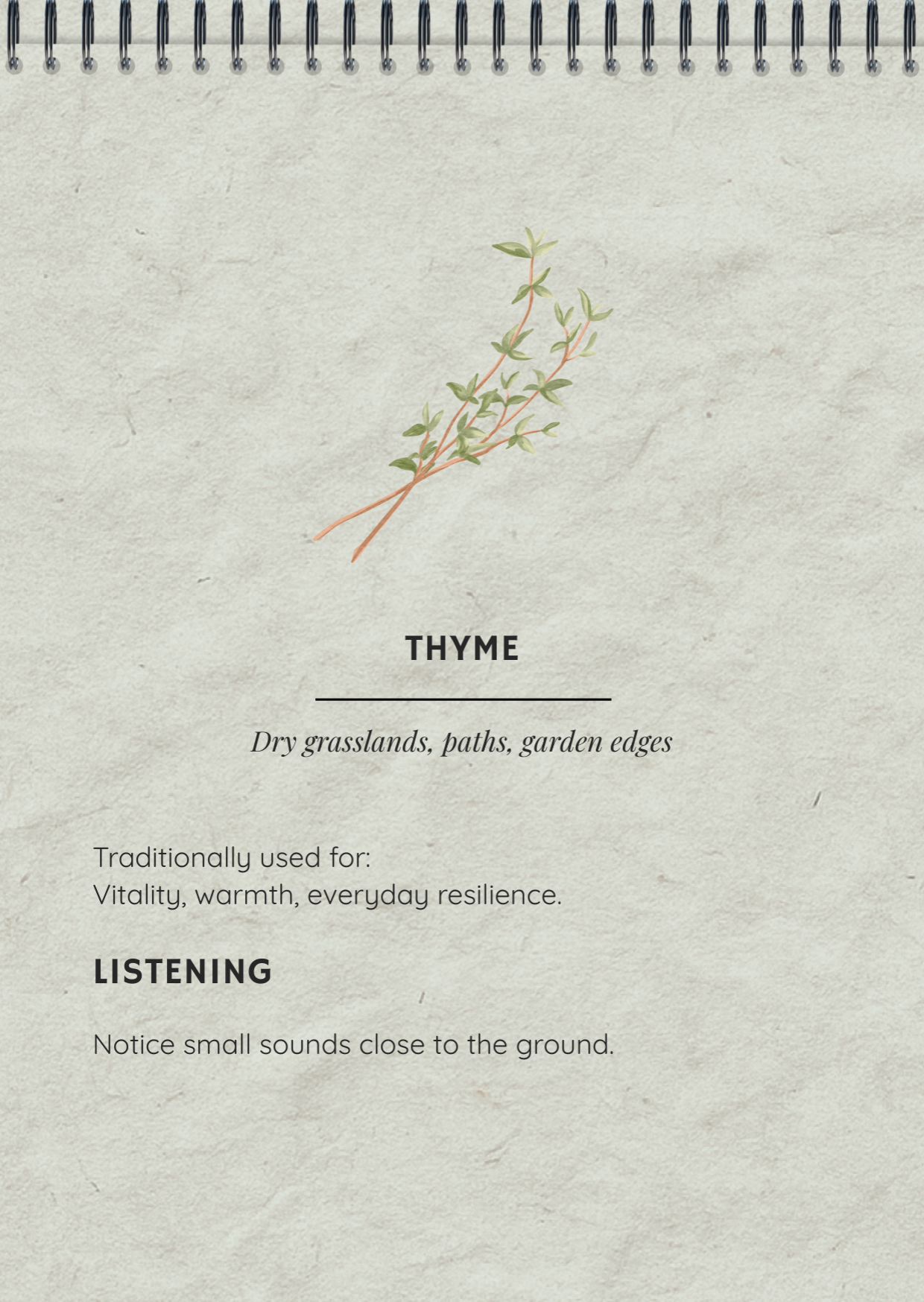 Twelve wild and cultivated plants: Lavender, Rosemary, Elderflower, Hawthorn and other. Each paired with a traditional use, a sound-based cue, and a question to sit with.