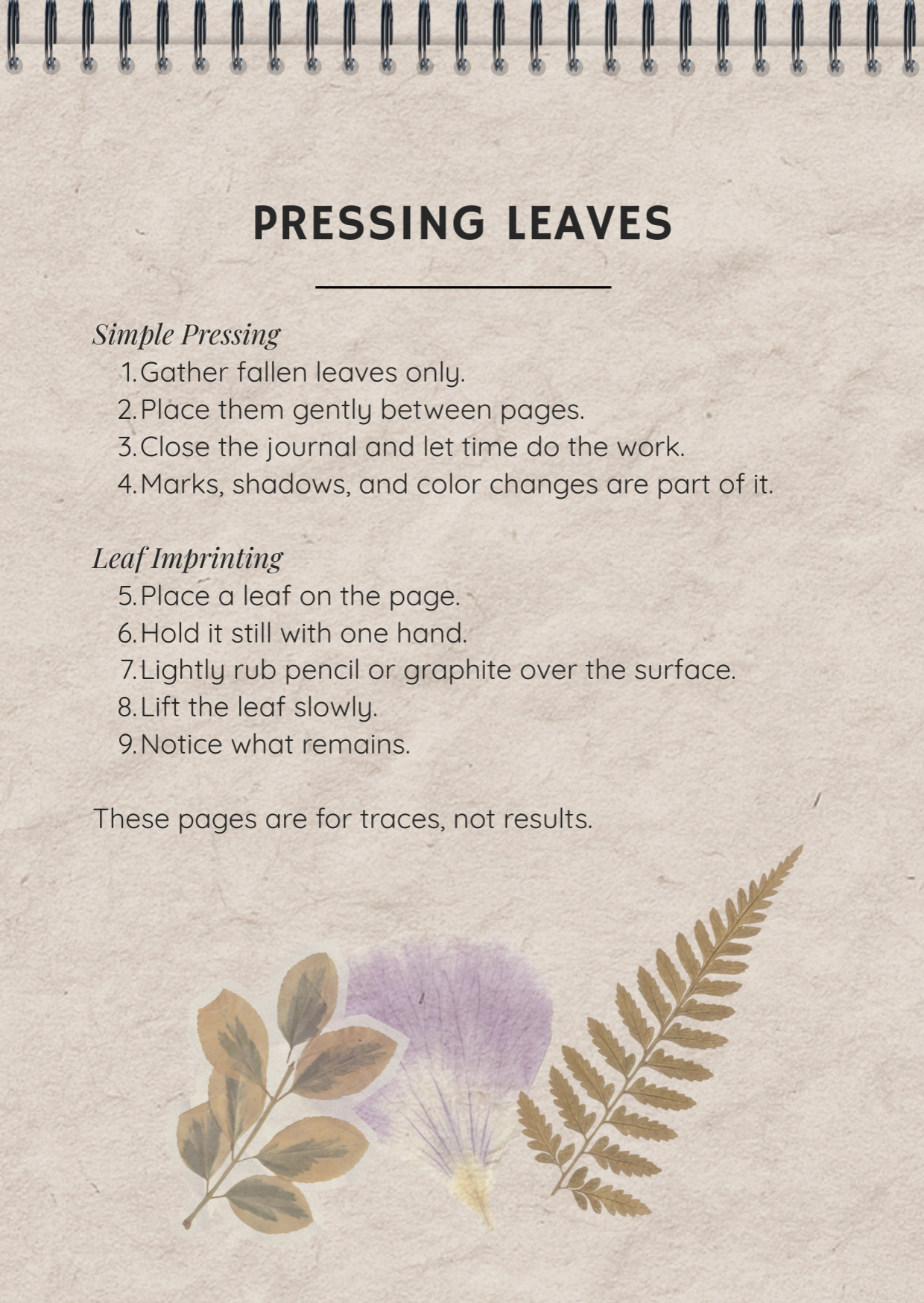 Five blank pages for drawing, pressing leaves, or leaf imprinting plus simple instructions. Space to bring the outside in, without a prompt telling you what to notice.